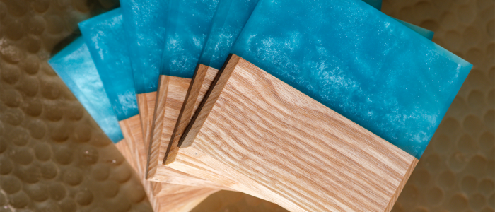 No harsh stains are applied to our products. We only use food-safe oil and wax, which provides a natural protective finish. Each of our products have different wood grain and epoxy patterns and no product will be identical. They are unique pieces of art.