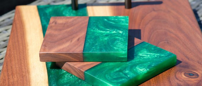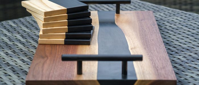 Carpentry Cam charcuterie boards are perfect for serving food and showing off an unique design while entertaining. Charcuterie boards can have a ‘river’ of coloured epoxy running between or along the side of the wood.